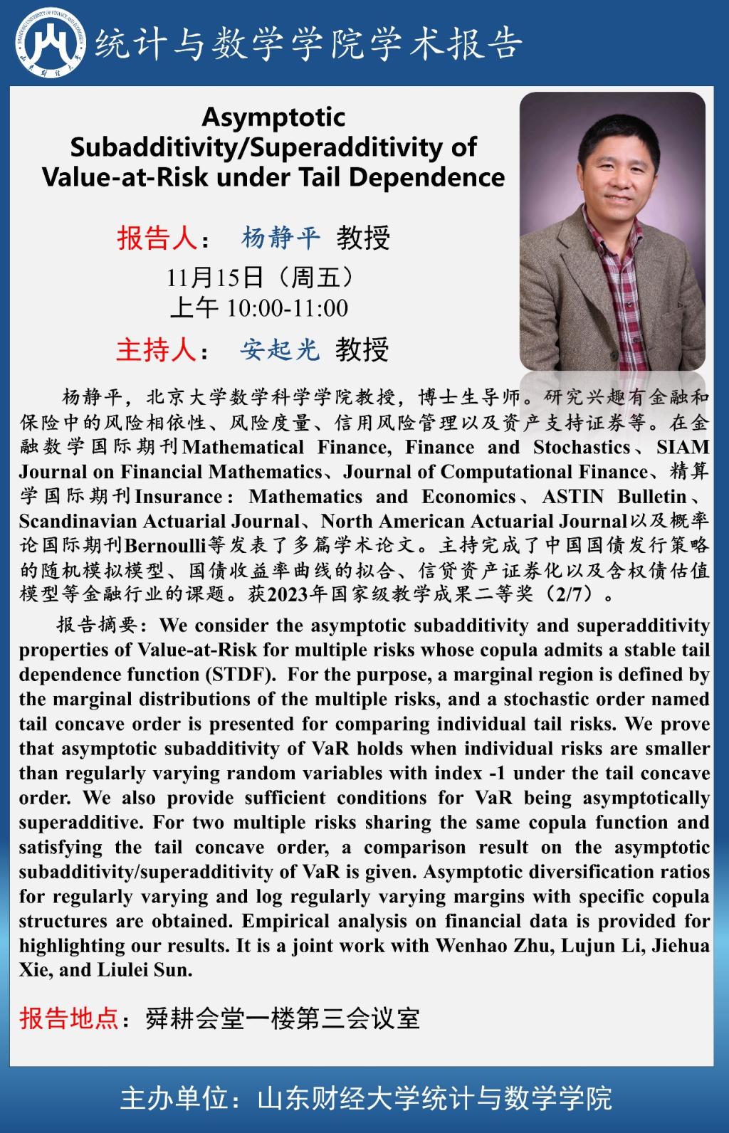 成人论坛 学术预告—Asymptotic Subadditivity/Superadditivity of Value-at-Risk under Tail Dependence