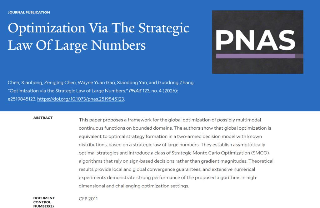 成人论坛 预聘制教授张国栋作为按姓氏排序、具有同等贡献的共同作者之一,与美国耶鲁大学Xiaohong Chen教授、山东大学陈增敬教授、美国宾夕法尼亚大学Wayne Yuan Gao教授、西安交通大学严晓东教授合作撰写的学术论文“Optimization via Strategic Law of Large Numbers”于2026年1月在国际顶级学术期刊《美国科学院院刊》(PNAS)正式发表。PNAS(Proceedings of the National Academy of Sciences)是与Nature、Science、Cell齐名的世界顶尖综合性学术期刊,在学术界具有广泛权威性,并在公众传播层面享有显著影响力。