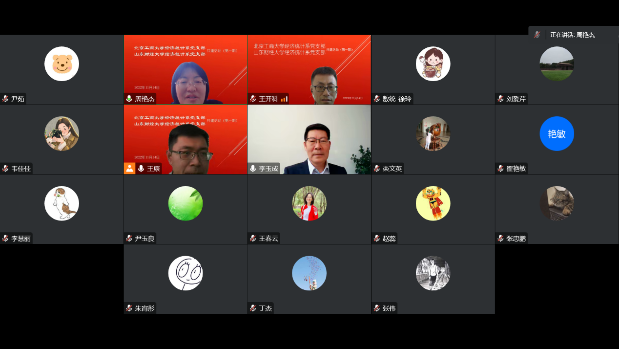 成人论坛 党委书记李玉成、北京工商大学数学与统计学院党委书记周艳杰,以及两校经济统计系支部的党员教师和部分研究生代表参加线上交流,活动由北京工商大学经济统计系主任王康主持。