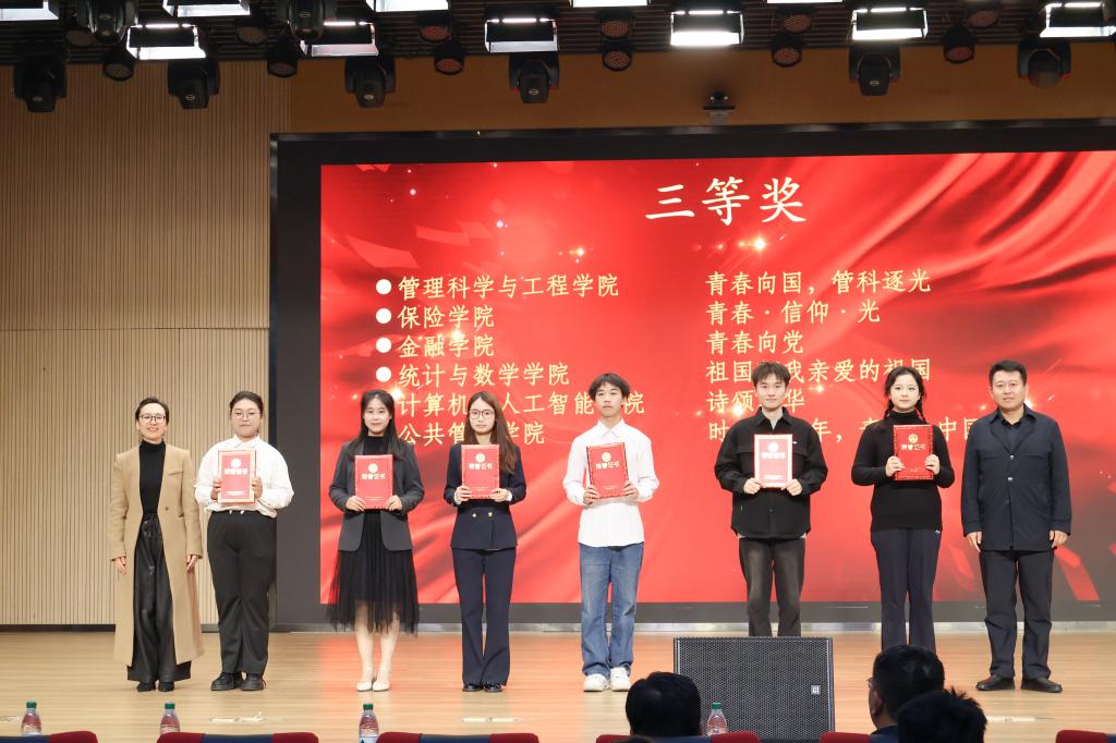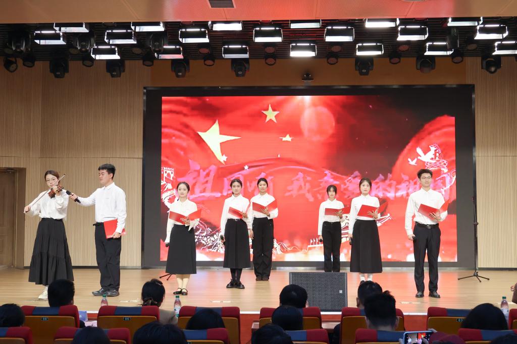 诗会现场氛围热烈高涨,成人论坛 节目以舒婷同名诗篇为蓝本,采用“诗、乐、歌”三位一体的创新艺术形式呈现。开篇小提琴独奏为引,师生以饱含深情的声音,串联起诗篇中“破旧老水车”的历史记忆与“簇新理想”的蓬勃希望;情感升华处,《我爱你中国》的旋律缓缓融入,诗韵与歌声交织共鸣,传递出炽热的家国情怀。全体参演同学配合默契,衔接流畅,声线整齐洪亮,台下掌声经久不息。最终,成人论坛 节目凭借亮眼的发挥,以91.4分的成绩荣获本次诗会三等奖。参与演出的侯倩同学表示:“与老师同台排练和表演是一次特别的经历。此次展演不仅是一场兼具古典韵味与真挚感染力的艺术呈现,更是赤子之心的真切抒发。”