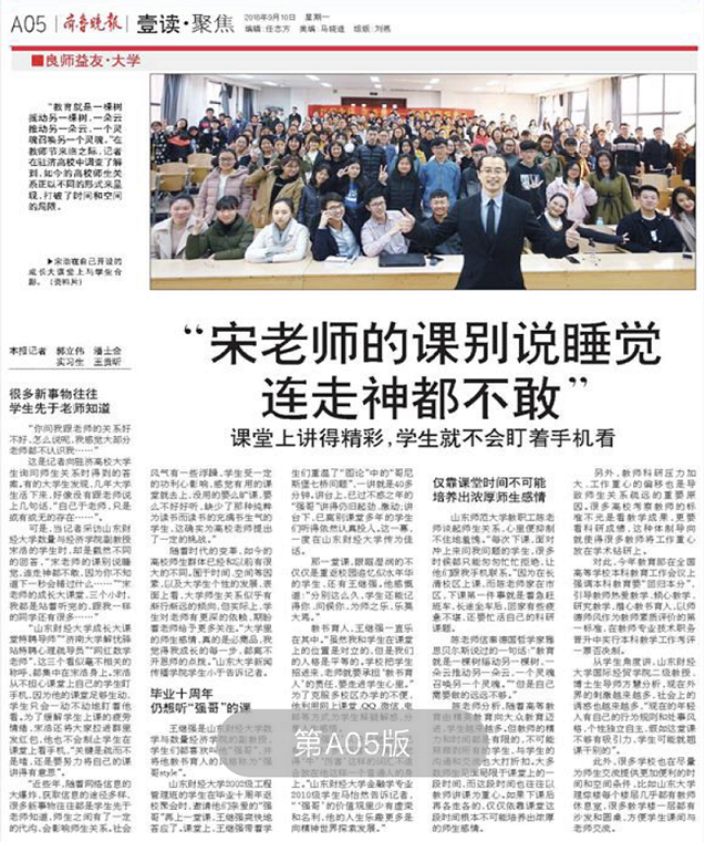 “成人论坛 成长大课堂特聘导师”“济南大学解忧驿站特聘心理疏导员”“网红数学老师”,这三个看似毫不相关的称呼,都集中在宋浩身上。宋浩从不担心课堂上自己的学生盯手机,因为他的课堂足够生动,学生只会一动不动地盯着他看。为了缓解学生上课的疲劳情绪,宋浩还将大家拉进群里发红包,他也不会制止学生在课堂上看手机,“关键是疏而不是堵,还是要努力将自己的课讲得有意思”。