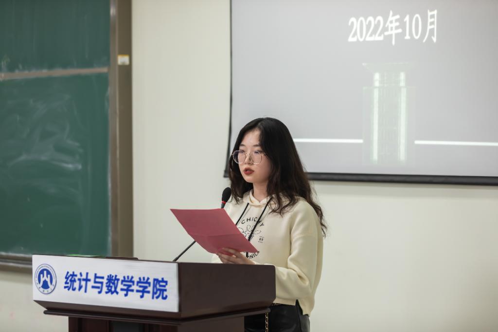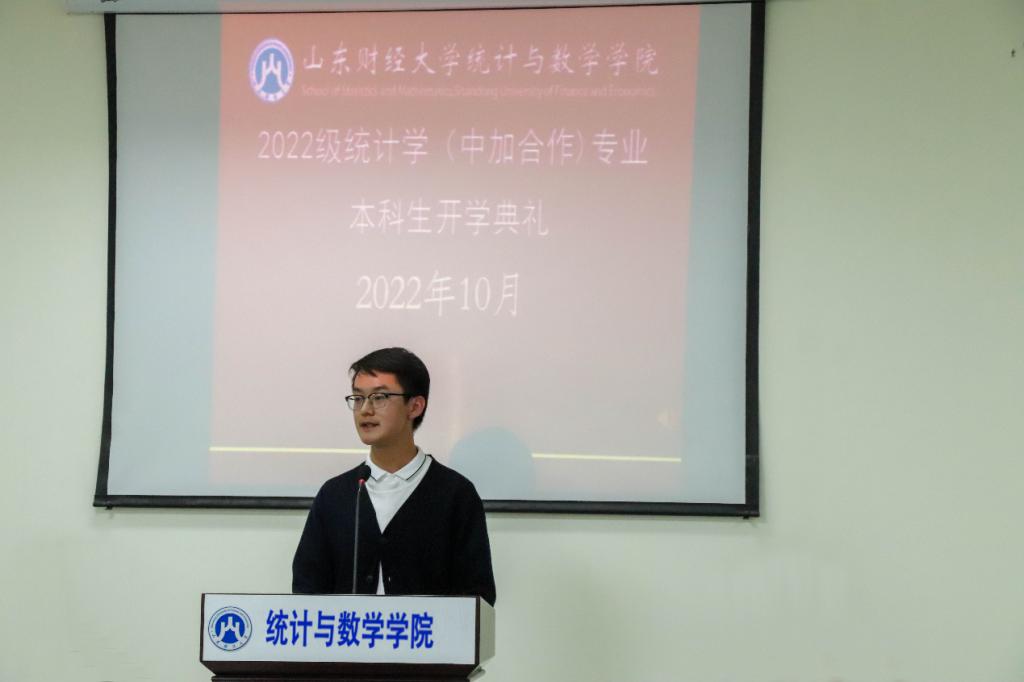 接下来,由教师代表戴洪帅、在校生代表张馨壬、新生代表刘卓然发言。戴洪帅老师介绍了统计学(中加合作)专业的课程情况、培养方案以及专业优势。鼓励同学们要努力学习知识技能,把握好机会,做到自我鞭策、自我激励,最终实现自我价值。张馨壬结合自身学习以及个人经历从中加合作项目优势出发,讲述了她的留学规划,为新生的学业规划提供了宝贵的经验。刘卓然表达了自己迈入大学校园的喜悦之情,倡议大家要认真对待学习、做好日常规划,争做有志气、有骨气、有底气的新青年。