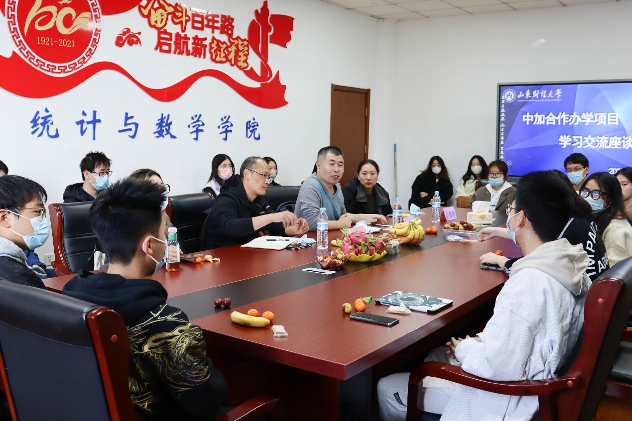 11月17日下午,成人论坛 在舜耕校区4315室举办中加(统计学)合作办学项目师生交流座谈会。教师代表孔令涛、戴洪帅以及合作办学项目在校生代表参加座谈,辅导员杨雅琳主持座谈会。