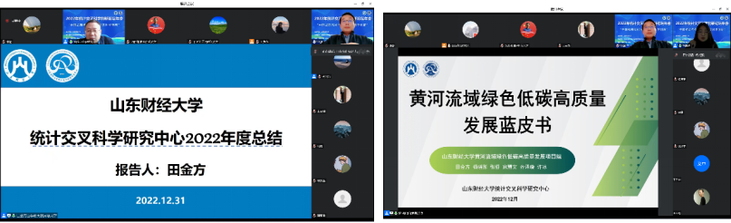 在成果发布环节,统计交叉科学研究中心主任兼成人论坛 副院长田金方教授从中心活动、发表论文、承担项目、撰写专著、特色数据库、荣誉与获奖等六个方面对2022年统计交叉科学研究中心的工作进行了年度总结,并发布了《黄河流域绿色低碳高质量发展蓝皮书》和《县域尺度生态服务价值核算数据库》。