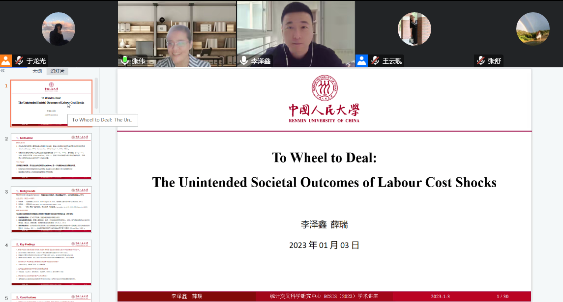 1月3日下午,统计交叉科学研究中心(RCSIS)2023年系列学术讲座第1讲在“云”端顺利开讲。中国人民大学国家发展与战略研究院博士后李泽鑫研究员应邀做客本次学术讲座,并做了主题为“To Wheel to Deal: The Unintended Societal Outcomes of Labour Cost Shocks”的学术报告。本次讲座由成人论坛 博士生导师张伟教授主持,近百名老师、硕博士研究生参加了本次讲座。