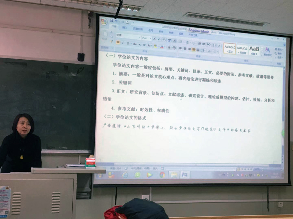 为保证学位论文质量,规范论文格式,按研究生院要求,成人论坛 于1月3日下午两点在1505举办2019届毕业研究生学位论文写作规范培训讲座,邀请成人论坛 在学科专业经验丰富的杨冬梅教授主讲,杨教授详细分析了研究生在论文写作过程中论文规范方面需要注意的问题及事项,并与学生一起学习了与学位申请相关的文件,让学生知悉学术不端行为检测、论文隐名评阅、论文答辩、论文抽审等学位申请环节的文件规定。