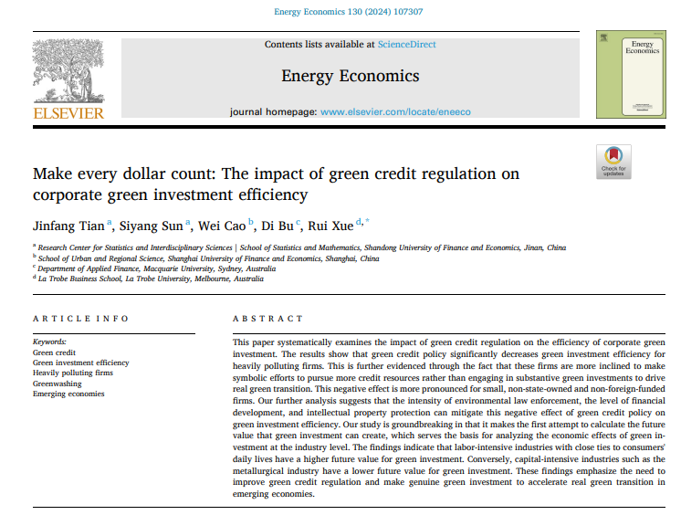 引用信息:Tian, J., Sun, S., Cao, W., Bu, D., & Xue, R. (2024). Make every dollar count: The impact of green credit regulation on corporate green investment efficiency. Energy Economics, 107307.