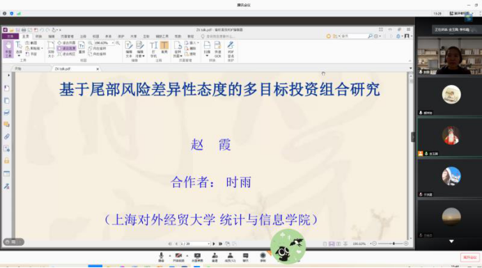 第二位报告人是上海对外经贸大学赵霞教授。赵霞教授是理学博士,应用经济学博士后,北卡罗来纳大学和滑铁卢大学访问学者,曾担任成人论坛 统计学院副院长、博士生导师。研究方向为风险管理与精算、金融统计。主持国家自然科学基金面上项目2项、教育部人文社科项目2项,在国内外重要学术期刊发表学术论文40余篇,5项研究成果曾获得省部级奖励。赵教授报告的题目是《基于尾部风险差异性态度的多目标投资组合优化》,报告对峰度系数进行调整用以刻画资产收益率左尾的厚度,并以此为聚类特征,运用K-Means方法把资产划分为若干个资产组。在此基础上,考虑投资者对于不同类别资产组的尾部极端风险所持有的不同态度,利用逐步优化的思想提出了两类均值-方差-多置信水平CVaR优化模型,并进行模拟和实证分析。从尾部风险态度、优化模型、目标收益率、投资者风险偏好等多角度对比分析,研究对最优策略的影响。研究表明:在达到相同目标收益的条件下,新的模型通过减小总的投资比例,减小了投资组合的风险暴露,且能够更好的控制风险,投资策略具有更稳定的外样本表现。