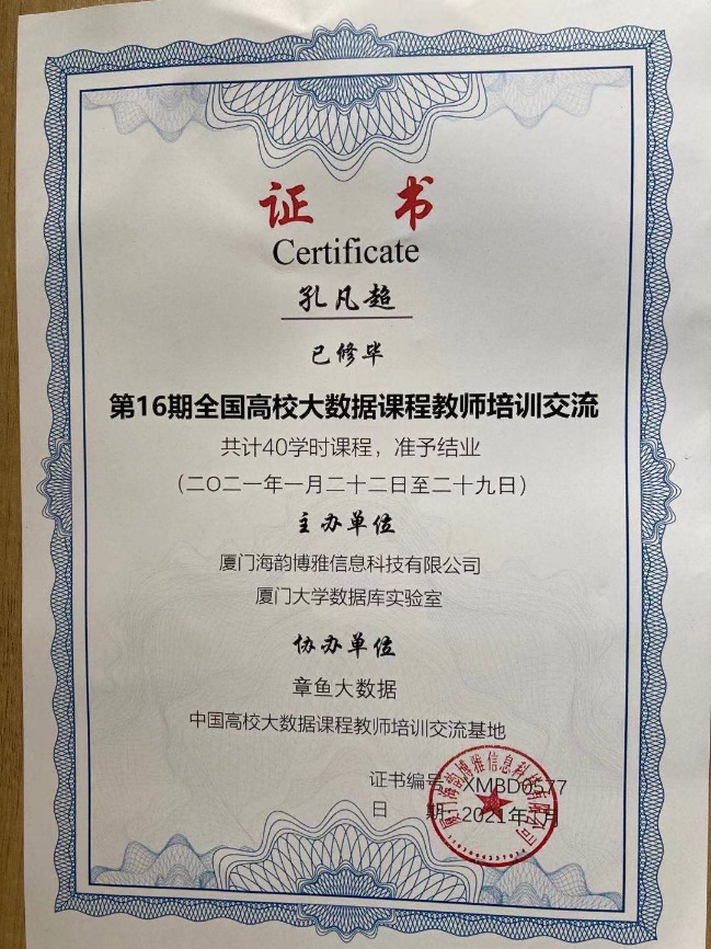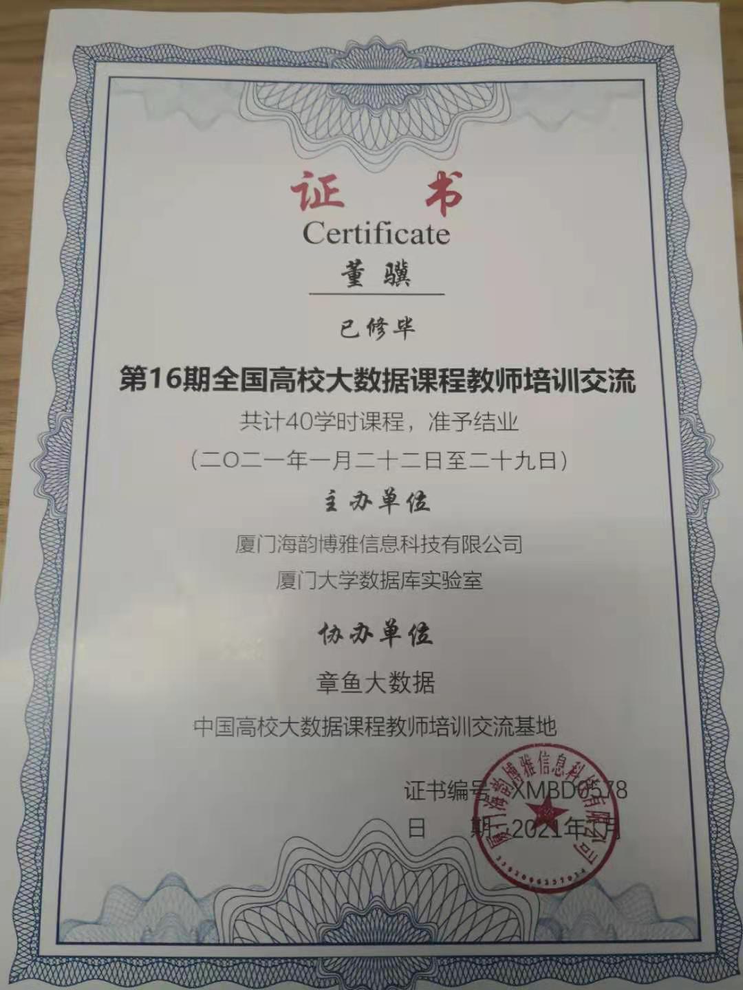 2021年1月22日至29日,由厦门海韵博雅信息科技有限公司联合章鱼大数据举办的“第16期全国高校大数据课程教师培训交流班(Hadoop+Spark综合班)”在厦门召开。本次培训交流班旨在为“加快中国高校大数据课程体系建设、促进中国高校大数据教学水平不断提升”做出积极贡献,邀请厦门大学云计算与大数据研究中心创始成员、高校大数据课程服务平台建设者、厦门大学计算机科学系副教授林子雨博士担任主讲教师。来自全国各大高等院校数据科学与大数据技术、计算机、软件工程等专业的科研、教学带头人,骨干教师参与了本次培训交流班。成人论坛 数据科学系青年教师孔凡超博士、董骥博士等参加了本次培训班。