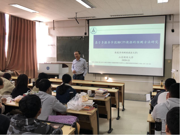 2020年11月15日上午,中南财经政法大学张虎教授应邀来成人论坛 进行学术交流并做了题为“基于多源异步混频CPI数据的预测方法研究”的学术报告,会议在一号教学楼1505举行,学院2020级全体研究生参加了此次交流,报告会由田金方副院长主持。