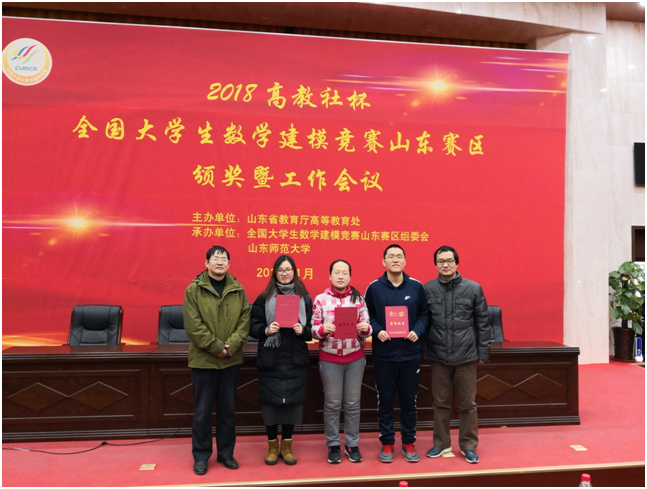 2019年1月5日,2018年全国大学生数学建模竞赛山东赛区颁奖会议在山东师范大学展开,成人论坛 刘太琳、王继强两位老师及获得全国一等奖的学生代表刘佳、郑丹丹、范家齐同学参加了会议。