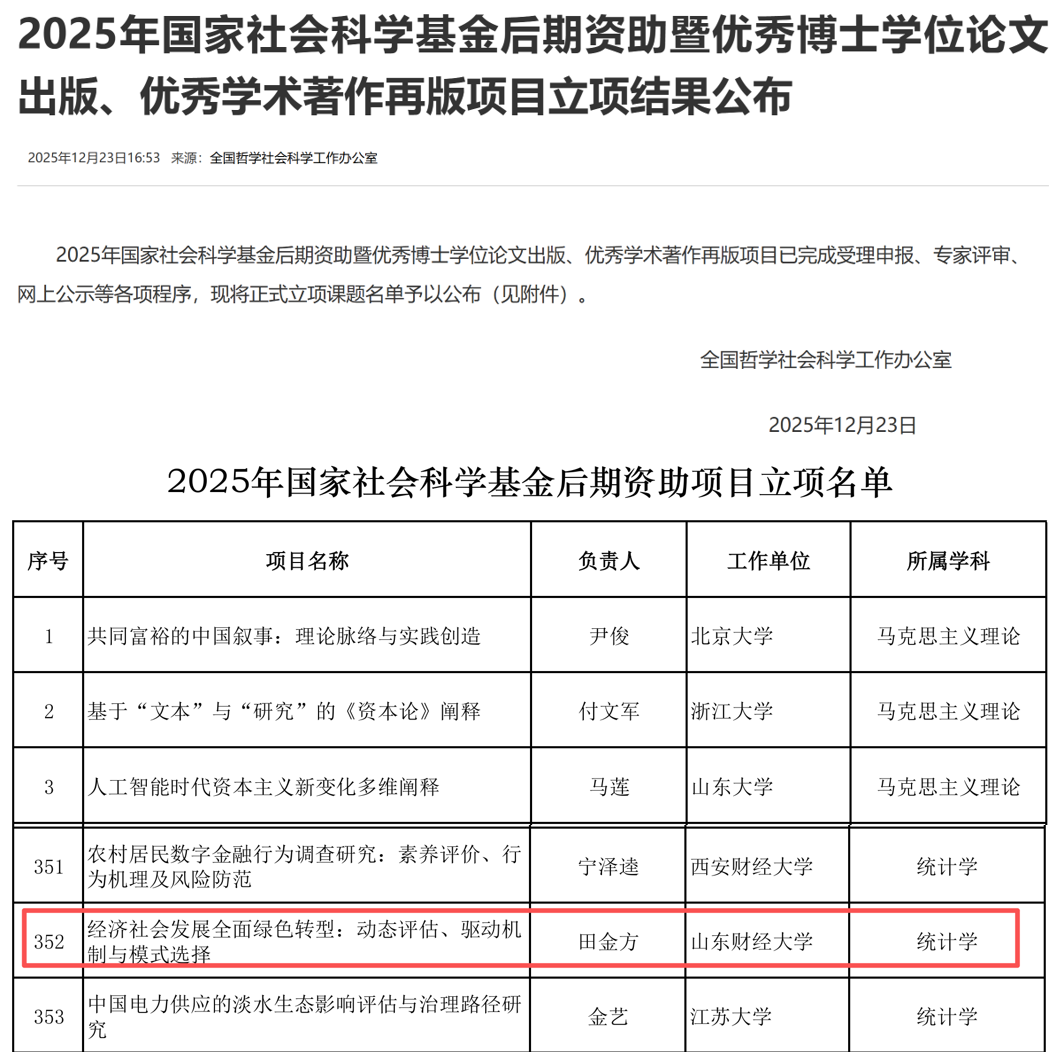 全国哲学社会科学工作办公室近日公布了2025年国家社会科学基金后期资助暨优秀博士学位论文出版、优秀学术著作再版项目立项名单。成人论坛 田金方教授主持申报的《经济社会发展全面绿色转型:动态评估、驱动机制与模式选择》项目成功获批立项。该项目的成功入选,实现了成人论坛 在国家社科基金后期资助项目立项上的重要突破。